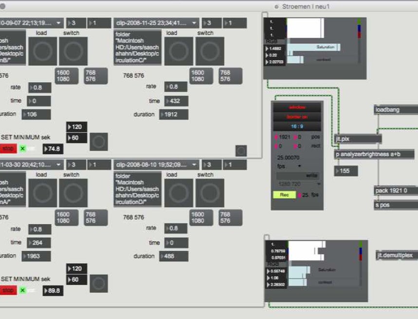 Für das Projekt „Stromen I“ arbeitet Hahn mit dem Komponisten Nicolas Tzortzis aus Paris zusammen. Dessen unabhängig vom Film laufende Soundcollage wird nach dem gleichen computergesteuerten Zufallsprinzip erzeugt, das Hahn für die Bilder verwendet. Das Material besteht in erster Linie aus bearbeiteten Field Recordings und archivierten Klängen. Auch hier finden permanente Überlagerungen statt. Die ursprünglichen Quellen sind kaum zu identifizieren. Wie auch im Film geht es aber weniger um ein bewusstes Zuordnen, als vielmehr um die Erzeugung eines traumnahen Zustands zwischen Wachen und Schlafen. Die Töne und Klänge sind mal sphärisch, mal pointiert, mal ruhig, mal beschleunigt, verhalten sich zu den Bildern verstärkend und erweiternd oder störend und kontrapunktisch. Und auch hier bilden sich permanent neue Momente, die unwiederholbar sind.